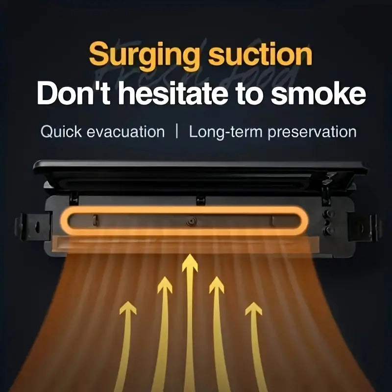 - đKompakt design: Med sin dolda krokdesign tar vakuumförslutaren minimal plats i köket. Den har en vattentĂ€t bas, externt utlopp, tyst drift och en förbĂ€ttrad tĂ€tningsgummidyna för att förhindra luftlĂ€ckage, vilket gör den sĂ€ker och bekvĂ€m att anvĂ€nda.