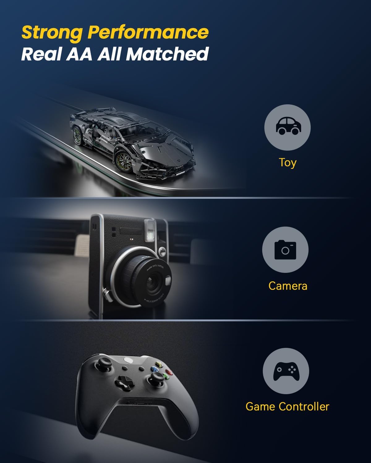 【Smart LED-display】LED-lampan visar laddningsstatus. Blinkande grönt indikerar laddning, fast grönt indikerar fulladdat, rött indikerar fel på batteriet eller temperaturstatus. Alla AA/AAA-batterier kan laddas fullt på 2,5 timmar i fast grönt tillstånd.